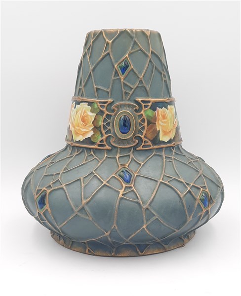 Vaso della serie "Holly". Austria, inizio secolo XX. Ceramica smaltata in blu con decori floreali sul collo e a rilievo dorati. Marcato sotto la base. (h cm 30) (difetti)