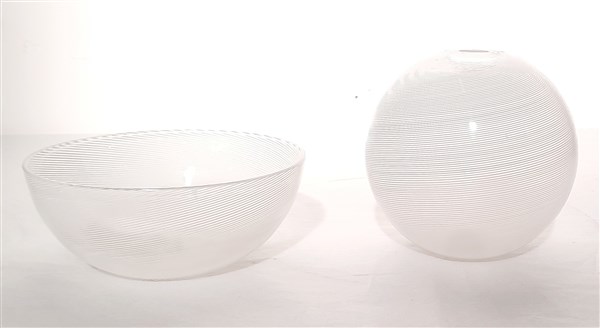 Lotto composto da un vaso globulare e una ciotola in vetro soffiato incolore a mezza filigrana lattimo. Murano, anni '80/'90. Firmati e datati a punta sotto la base. (vaso h cm 14; ciotola h cm 6,5, d cm 16,5)