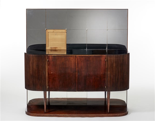 Controbuffet a quattro ante delle quali le laterali curve; parte superiore e inferiore specchiata. Italia, anni '40. Legno di mogano massello impiallacciato e bordato con fronte e fianchi parzialmente grissinati, piano in opalina nera. (cm 160x163x45) (difetti e mancanze)