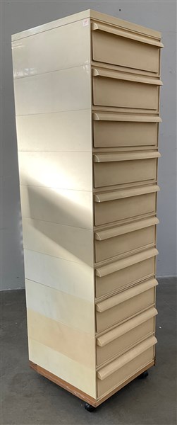 Cassettiera a rotelle a dieci cassetti modello "4601". Produzione Kartell, Milano, anni '70. Plastica bianca. Marcata. (cm 42x149x42) (difetti)