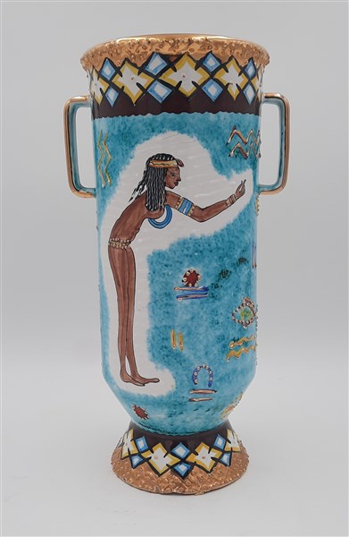 Vaso biansato in ceramica smaltata sotto vetrina in policromia e oro decorato con figure egizie maschile e femminile e fondo marino. Italia, secolo XX. Firmata sotto la base. (h cm 35) (difetti)