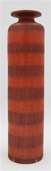 Bottiglia in ceramica graffita nei toni del rosso e arancio. Italia, anni '50. Iscritta sotto la base "574 ITALY". (h cm 38) (difetti)