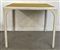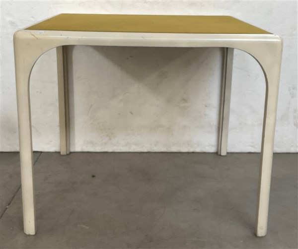 Tavolo in legno verniciato bianco con piano rivestito in tessuto color senape. Italia, anni '70/'80. (cm 84x70x84) (difetti e restauri)