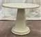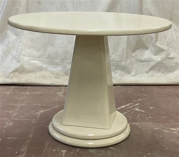 Tavolo in legno verniciato bianco con base troncopiramidale e piano circolare.