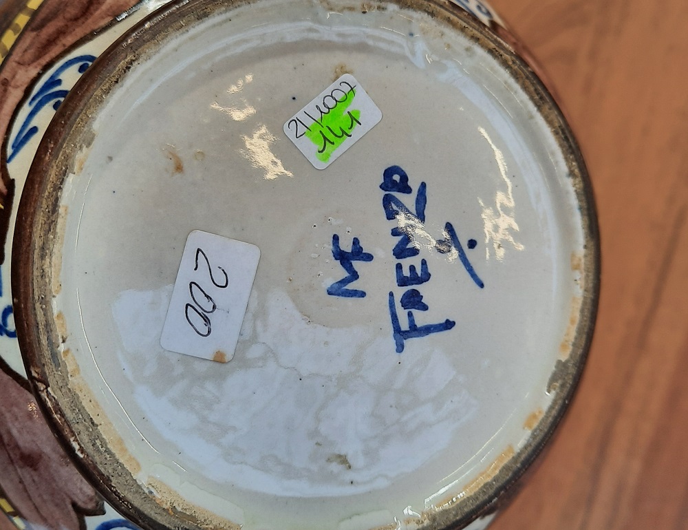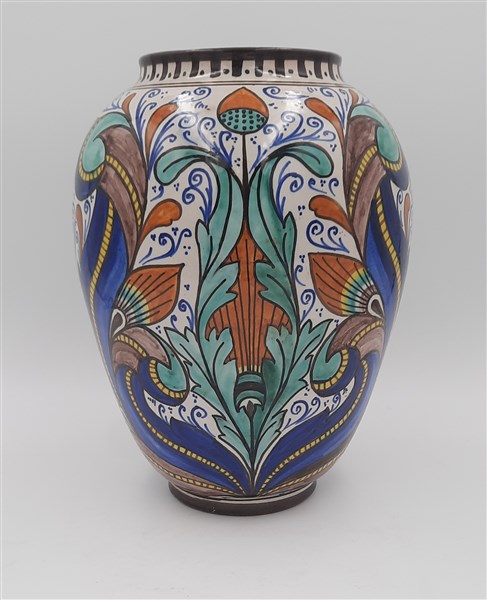 Vaso in ceramica con decoro policromo smaltato sotto vetrina di disegno tradizionale. Faenza, anni '10/'20. Marcato sotto la base “MF FAENZA”. (h cm 29)