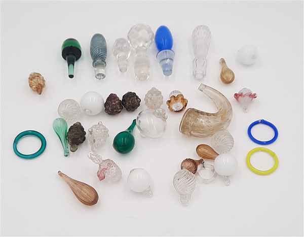 Lotto composto da sei tappi e ventisette oggetti in vetro di colori, dimensioni e fatture diverse. Secolo XX.