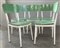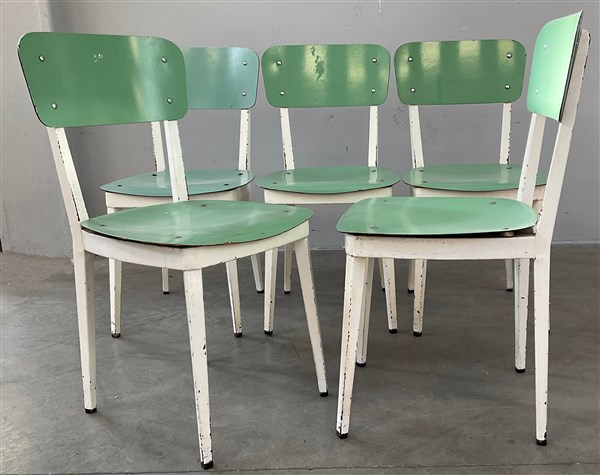 Lotto composto da cinque sedie con struttura in metallo verniciato bianco, seduta e schienale in formica verde chiaro. Italia, anni '50. (cm 43x86x44) (difetti e piccole mancanze)