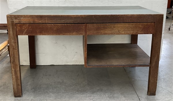 Tavolo da lavoro in legno massello e impiallacciato con due cassetti e stipo. P