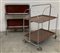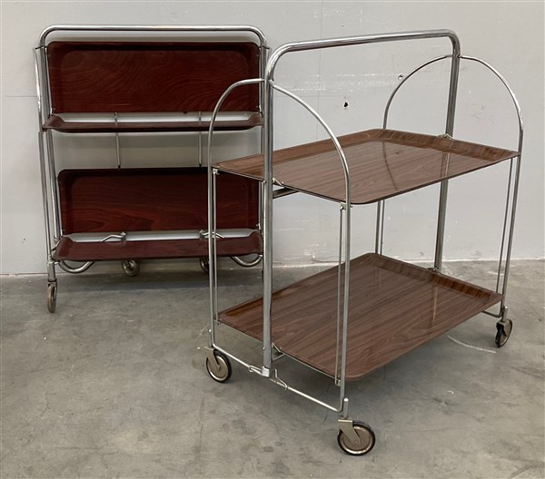 Coppia di carrelli pieghevoli con struttura in metallo e vassoi in plastica a effetto legno. Italia, anni '70. (aperto cm 69x78x41,5) (difetti)
