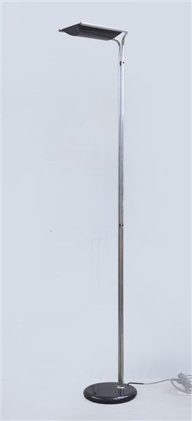 Lampada da terra alogena con fusto in metallo, base e diffusore in plastica nera. Italia, anni '70. Recante etichetta adesiva del produttore. (h cm 195) (difetti)