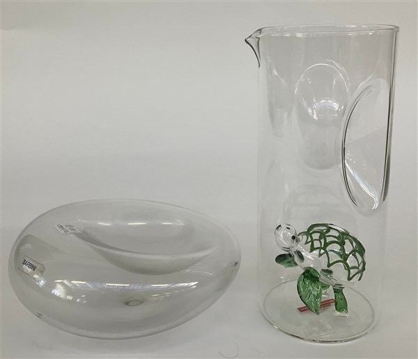 Lotto composto da un svuotatasche in vetro trasparente incolore recante etichetta adesiva della manifattura Barbini, unito a una caraffa in vetro trasparente incolore con inclusa nel corpo una tartaruga in vetro trasparente incolore e verde firmata sotto la base Massimo Lurandon. Italia, secolo XX. (h max cm 25,5)