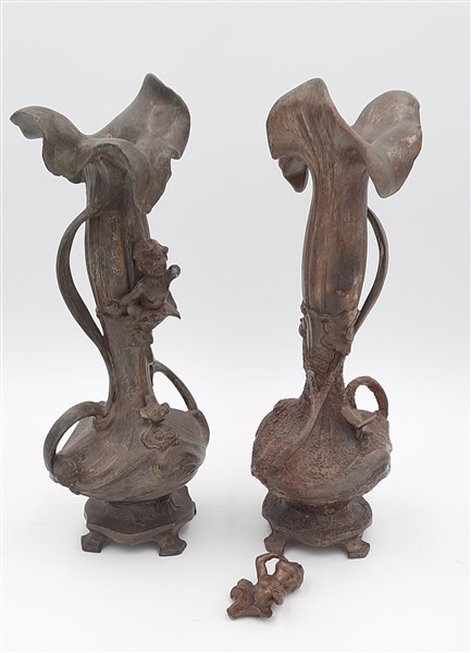 Lotto di due vasi Liberty in fusione metallica con figure a rilievo. Inizio secolo XX. Firmati alla base. (h cm 32) (difetti e mancanze)