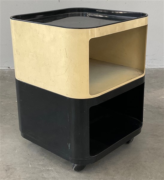 Mobile componibile su rotelle a due moduli modello "4970". Produzione Kartell, Milano, 1967. Plastica bianca e nera. Marcati. (cm 37,5x49,5x37,5) (difetti)