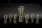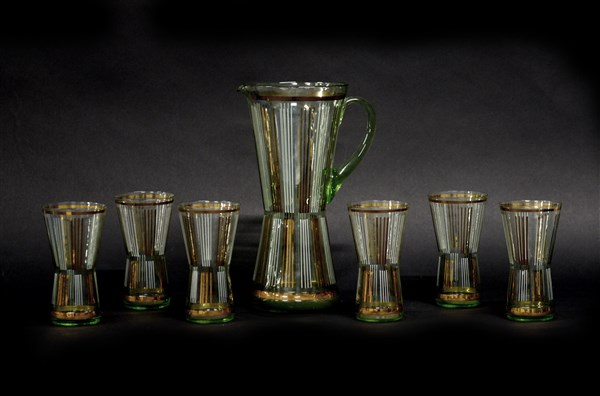 Servizio da bibita composto da brocca e sei bicchieri con corpo a clessidra in vetro trasparente verdino chiarissimo e decorato a listelli verticali in bianco e oro. Anni '70. (misure diverse) (lievi difetti)