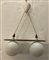 Lampada da sospensione a due luci con struttura in legno di teak, coppe diffusori in vetro incamiciato lattimo. Italia, anni '90. (cm x54,5x45)