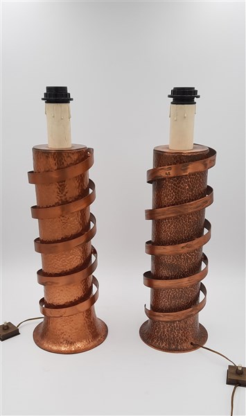 Coppia di lampade da tavolo in rame sbalzato. Italia, secolo XX. Un esemplare firmato sotto la base. (h cm 50)