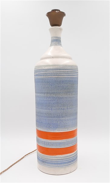 Lampada da tavolo con corpo in ceramica smaltata nei toni del bianco, azzurro e arancio. Italia, secolo XX. Marcata sotto la base "BASE MADE IN ITALY 1843". (h cm 49) (lievi difetti)