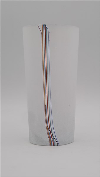 Vaso in vetro bianco incolore e con applicazioni a filamenti policromi. Manifattura Kosta Boda, Svezia, anni '70. Marcat, firmato e numerato a punta sotto la base. (h cm 20)