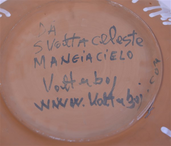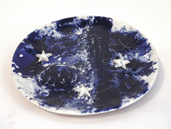 Piatto in ceramica smaltata sottovetrina nei toni del blu e del bianco con applicazioni di stelle in rilievo. Italia, secolo XX. Firmato sotto la base. (d cm 42)