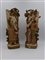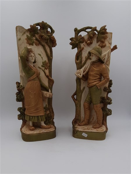 Due sculture in ceramica smaltata in verde, marrone e bianco con alberi e figure in costume tradizionale a tutto tondo. Prima metà secolo XX. Marcate sotto la base. (h cm 43) (lievi difetti)