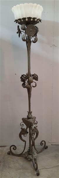 Lampada da terra con fusto in ferro battuto e saldato patinato verde, lamina di ferro sbalzata in foggia di foglie e fiori, diffusore in vetro soffiato opalescente a corpo costolato e superficie interna "rugiadosa". Italia, seconda metà secolo XX. (h cm 180) (lievi difetti)