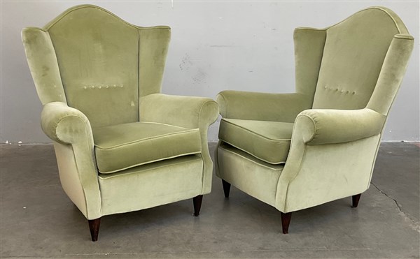 Coppia di poltrone con piedini troncoconici in legno e rivestimento in velluto color salvia. Anni '50. (cm 81x100x67) (lievi difetti e restauri)