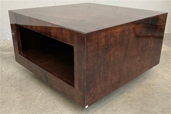 Tavolino da salotto con vano portariviste. Italia, seconda metà secolo XX. Legno rivestito di pergamena colorata e verniciata al poliestere. Esemplare eseguito su misura. (cm 78x47,5x78) (difetti)