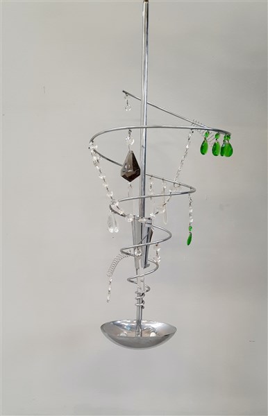 Lampada a sospensione modello "Astrea". Produzione Artemide, Milano, 1990. Struttura a spirale in metallo cromato e elementi in vetro colorato variamente tagliati. (h cm 93) (lievi difetti e mancanze)