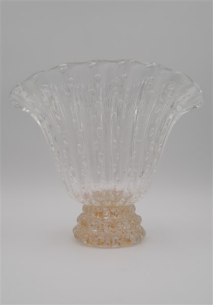 Vaso in vetro soffiato trasparente incolore costolato con inclusione di bolle, base con inclusione di foglia d'oro. Murano, seconda metà secolo XX. Recante etichetta sotto la base. (cm 28x24x14,5)