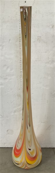 Grande vaso in vetro calcedonio nei toni del giallo, arancione, rosso, bruno, azzurro, lattimo. Anni '70. (h cm 133,5) (lievi difetti)