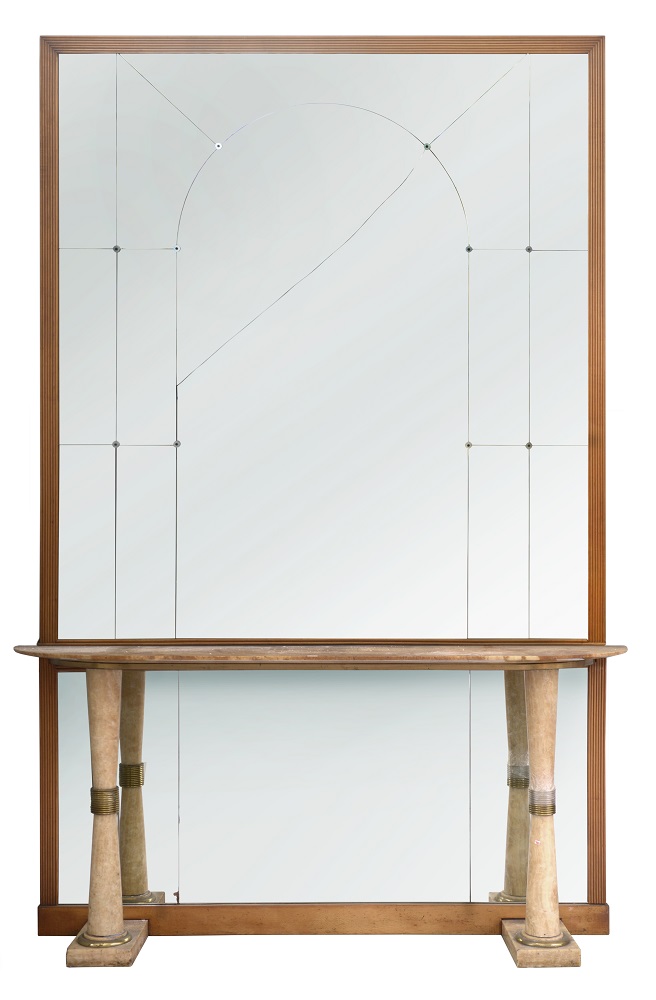 Consolle con colonnine a forma di clessidra in marmo e ottone e piano in marmo. Specchiera con cornice in legno. Italia, anni '50. (consolle cm 185x92x40; specchiera cm 172x186) (gravi difetti e mancanze)