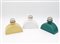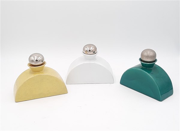 Tre bottiglie di forma semicircolare in ceramica smaltata bianca, gialla e verde con tappi rivestiti in metallo. Laveno, secolo XX. Marcati sotto la base. (cm 18x14x7,5) (lievi difetti)