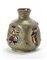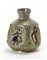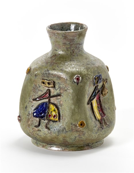 Vaso di forma quadrangolare con lati schiacciati in ceramica smaltata nei toni del verde e bruno con raffigurazioni a rilievo di personaggi stilizzati e smaltati in giallo, blu, viola, azzurro, bruno. Faenza, anni '50/'60. Firmato sotto la base “ZANNONI FAENZA”. (h cm 23)