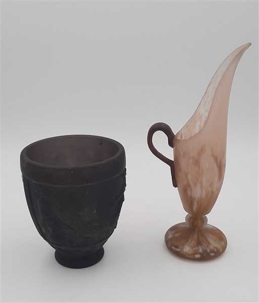 Lotto composto da un versatoio in vetro firmato a punta Schneider con ansa applicata a caldo e una coppetta in pasta di vetro firmata De Feure con decori di ispirazione classica a rilievo. 1925ca. (h cm 25; h cm 14) (difetti)