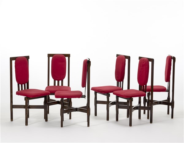 Sei sedie. Produzione Isa, Ponte San Pietro, seconda metà secolo XX. Legno massello e impiallacciato, seduta e schienale imbottiti e rivestiti in tessuto rosso. (cm 40x90x48) (lievi difetti e restauri)