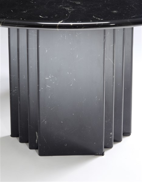 Tavolo con base composta da lastre in marmo nero venato affiancate a scalare su sottostruttura metallica, piano circolare in marmo nero. Italia, anni '60/'70. (h cm 72; d cm 150) (lievi difetti e restauri)