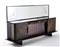 Grande credenza Novecento a due ante laterali, un vano centrale ad ante scorrevoli e tre cassetti sottopiano. Base, piano superiore e fianchi in legno tinto all'anilina, sovrapiano in opalina nera, ante lastronate in rovere trattato all'anilina, maniglie intagliate in legno massello. Alzata a specchio decorato a getto di sabbia con scene di caccia. Italia, 1930ca. (cm 280x150x60) (difetti)