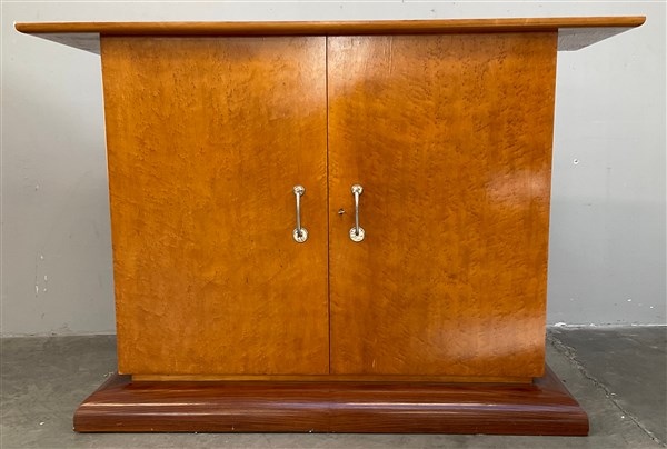 Mobile Art Déco a due ante impiallacciato in radica; basamento e corpo impiallacciato in noce. Maniglie in metallo nichelato. Interno a due ripiani e un cassetto impiallacciati in acero. Italia, anni '30. (cm 160x109,5x60) (lievi difetti e piccoli restauri)