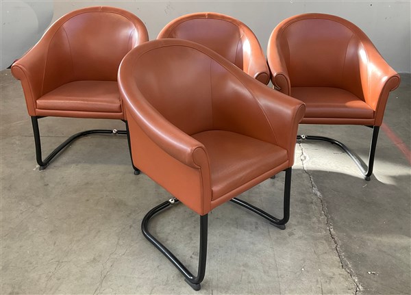 Lotto composto da quattro poltroncine con struttura in tubolare di acciaio verniciato nero, rivestimento in pelle marrone. Torino, seconda metà secolo XX. Marcate. (cm 67x85x60) (lievi difetti)