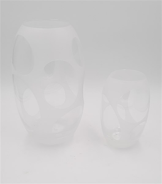 Lotto composto da due vasi in vetro trasparente incolore e parzialmente sabbiato decorato con ovali. Murano, produzione recente. Firmati all'acido alla base. (cm h 19; cm h 30)