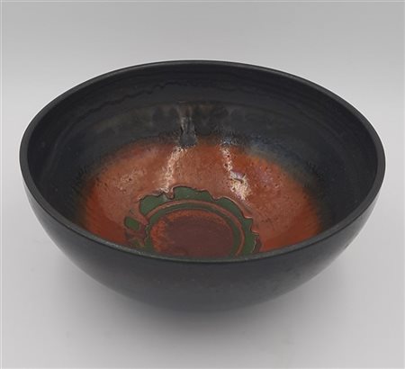 Ciotola in ceramica smaltata nei toni del bruno, arancio e verde. 1943. Firmata e datata sotto la base. (h cm 13; d cm 29)