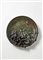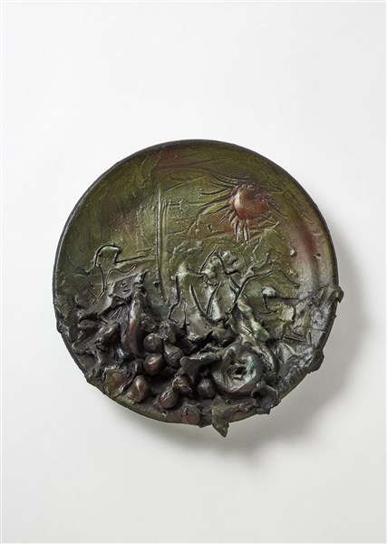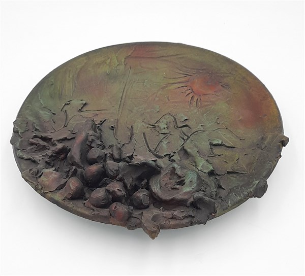 Piatto in ceramica smaltata in verde e rosso decorato con paesaggio a rilievo e sole. 1962. Locato e datato sotto la base. (d cm 30)