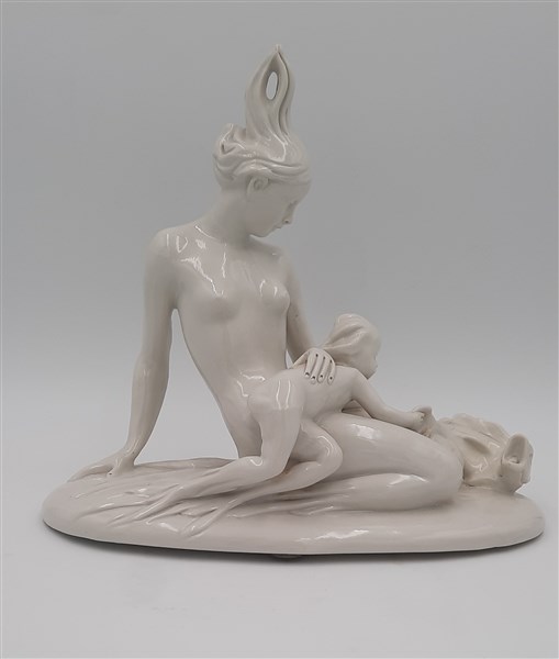Scultura raffigurante due sirene e un pesce. Manifattura Vibi, Torino, 1931. Ceramica formata a colaggio e smaltata in bianco sotto vetrina. Firmato e datato "Pannunzio 14 4 31". (h cm 28) (lievi difetti e restauri)