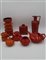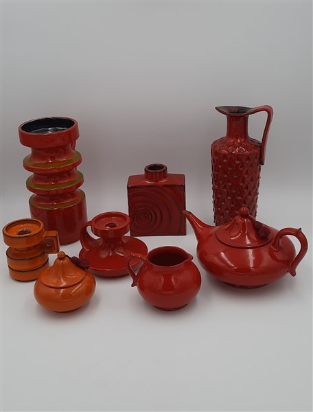 Lotto composto da otto oggetti in ceramica smaltata sotto vetrina in rosso, arancione e verde di dimensioni diverse. Produzione recente. (lievi difetti)