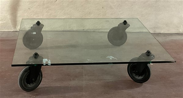 Tavolo con ruote. Produzione Fontana Arte, Milano, anni '80. Vetro molato e rotelle industriali. Segnalazione al "Compasso d'oro" 1981. (cm 115x25,5x115) (gravi difetti)