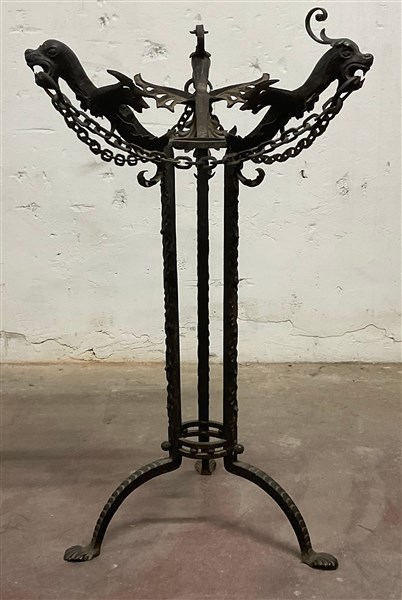 Tripode in ferro battuto decorato da tre teste di drago reggenti anelli e catene. Italia, prima metà secolo XX. (h cm 96) (difetti)
