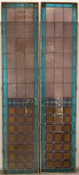 Coppia di vetrate con vetri policromi legati a piombo. (cm 50x234 ca,) (gravi d