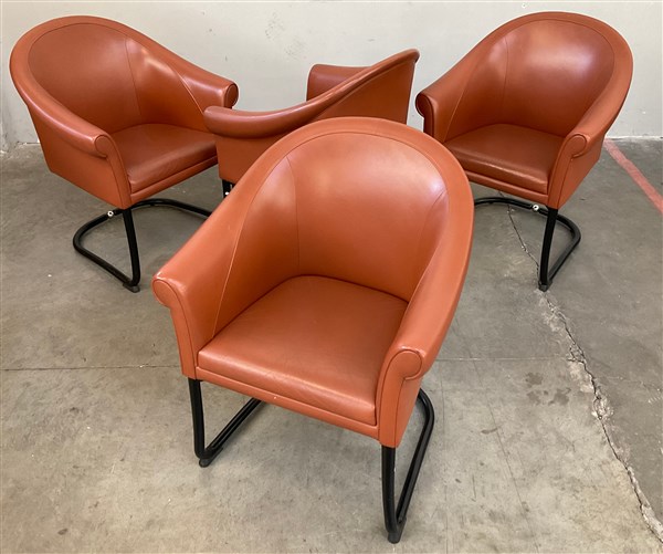 Lotto composto da quattro poltroncine con struttura in tubolare di acciaio verniciato nero, rivestimento in pelle marrone. Torino, seconda metà secolo XX. Marcate. (cm 67x85x60) (lievi difetti)