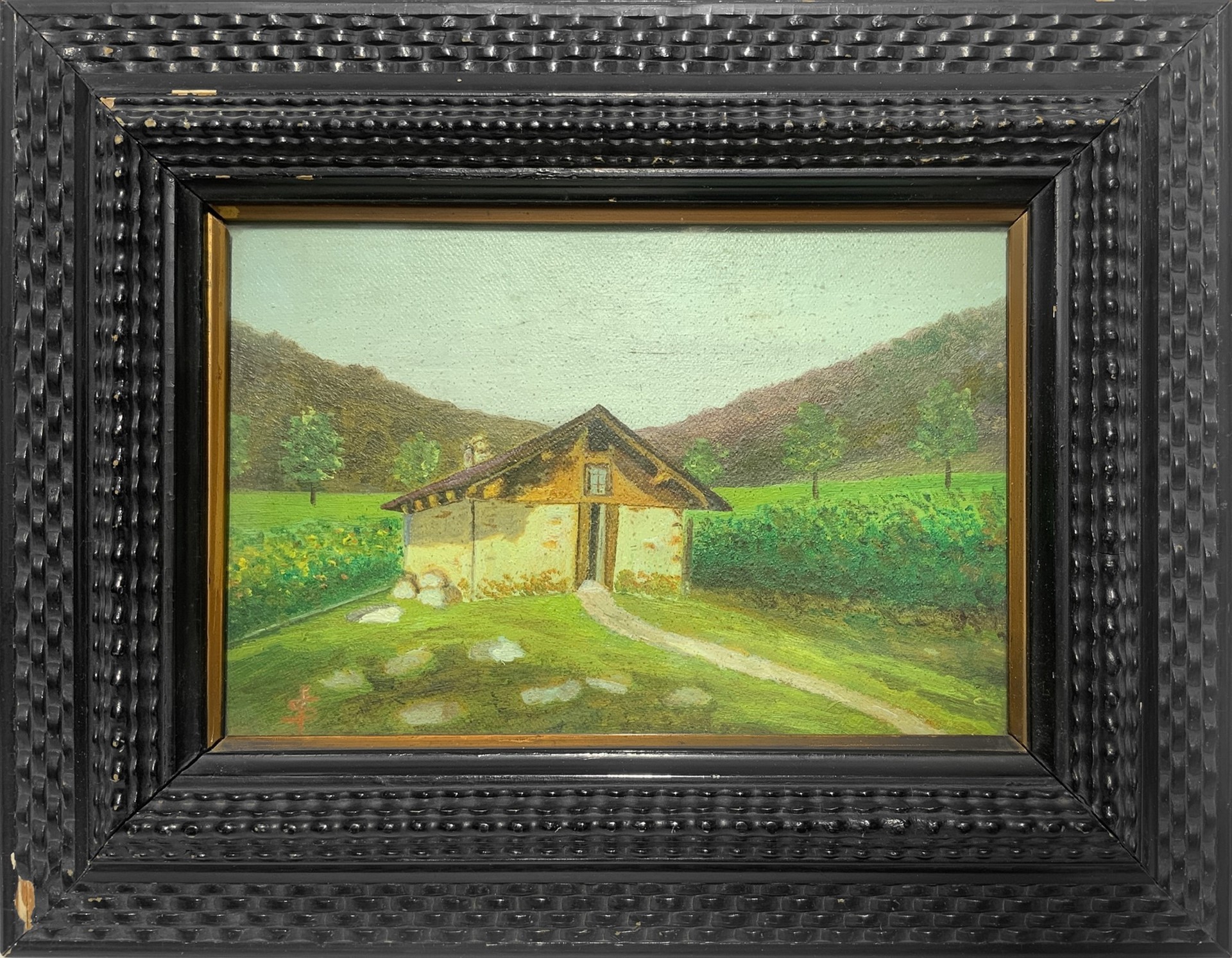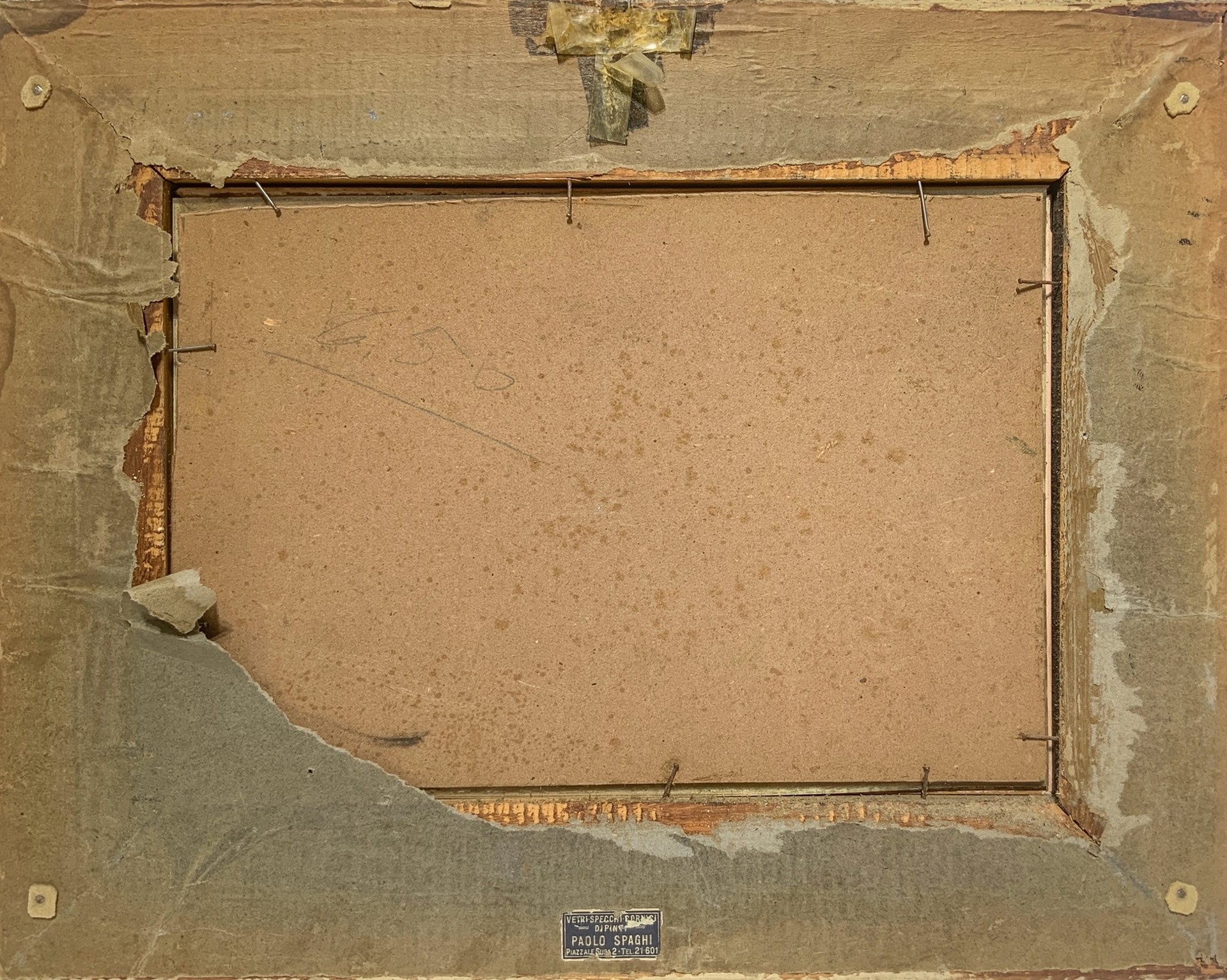 Spaghi, Paolo - Paesaggio con casa, nineteenth century 17x26 cm, in cornice 29x38 cm Dipinto a olio su cartone pressato Firmato con monogramma S.P. in basso a sinistra, etichetta con nome dell'artista sul retro ed in basso al centro. In cornice nera ebanizzata guilloché.