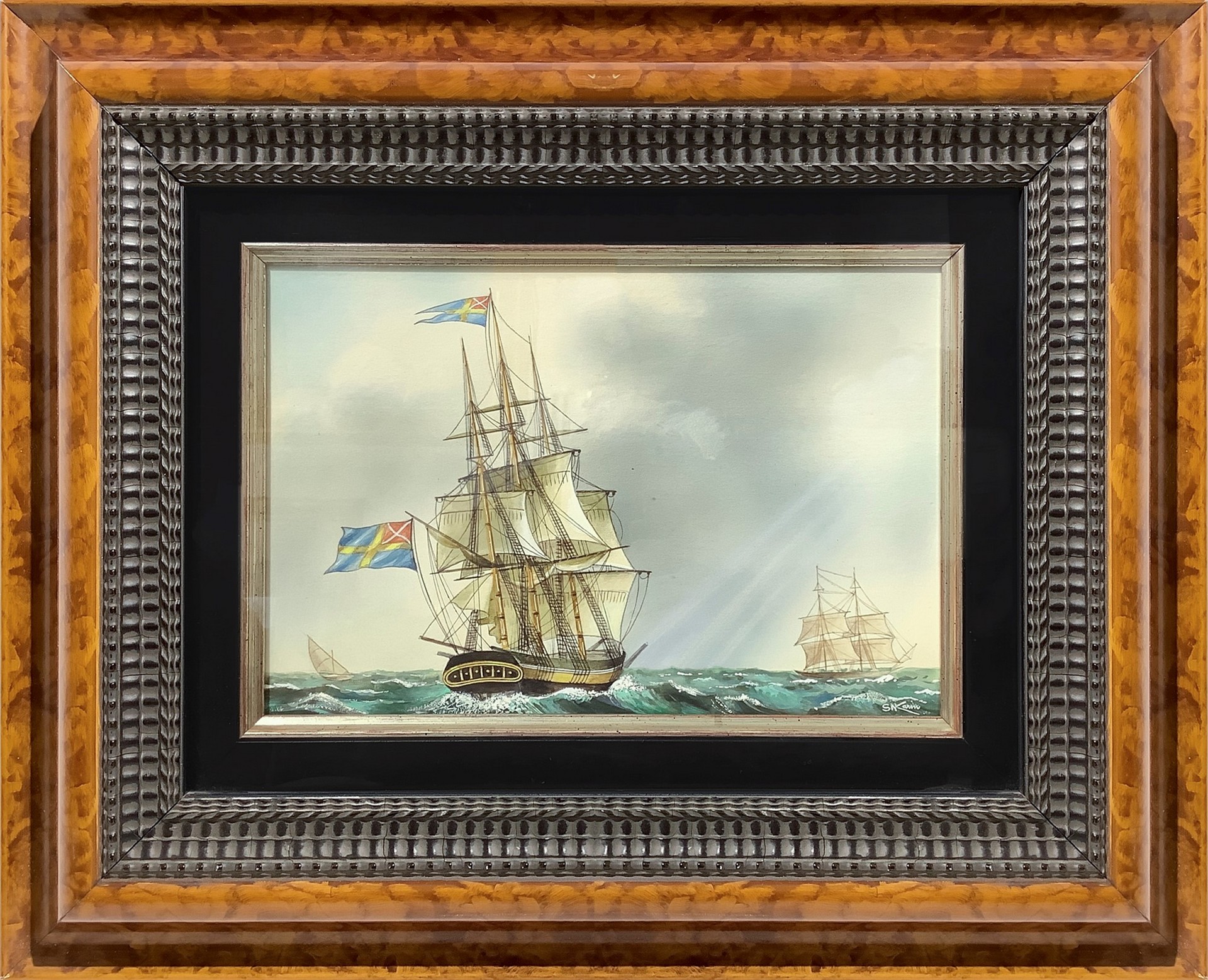 Karim, Sysko (1877-?) - Galeoni in mare, nineteenth century Cm 17x24 in cornice cm 34x42 Dipinto a tecnica mista su cartone Firmato "S. Karim"